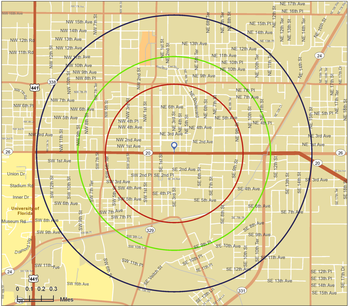 The first step was defining downtown. There’s no definition for it, of course. But just from having lived in Gainesville for about five years (two of those downtown) I would say it’s characterized by densely placed bars and clubs; old warehouses converted to restaurants, and other redevelopment; historic neighborhoods; and government buildings. Or, in spatial terms, roughly from W 6th Street to E 9th Street, and Depot Ave. to N 8th Ave. On the BAO map, I placed a point roughly in the center of this rectangle, at University Ave and E 3rd Street. From here, users can define three rings of varying size extending from their point and use these as their geographic areas from which to derive data. Thus, I can define “downtown” by three areas of varying size, which is useful since there isn’t a clear definition of it. My three circles had radii of 0.5, 0.7, and 1.0 miles from the centerpoint.