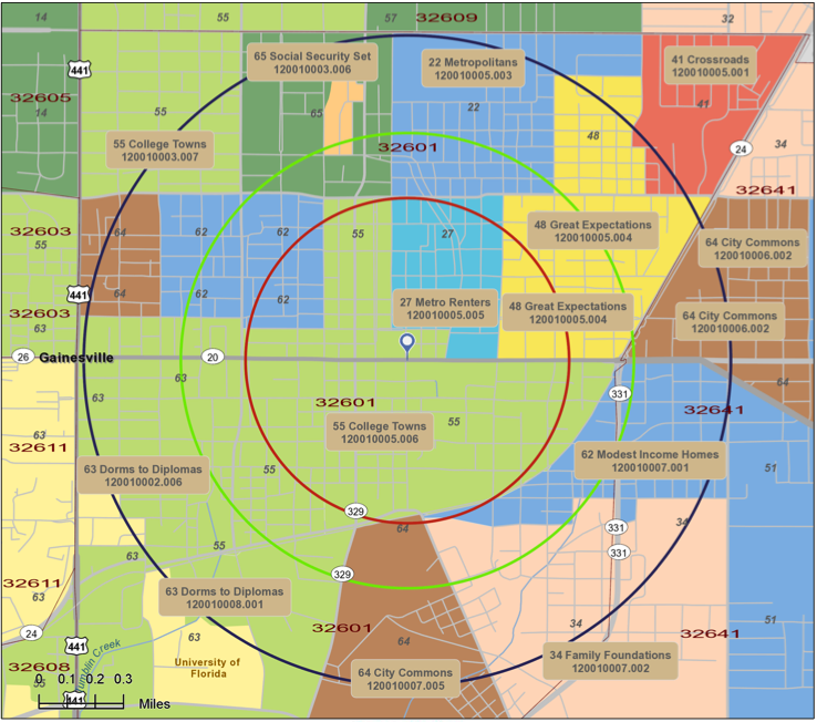 Briefly, two other groups that are larger segments in the two outer downtown rings are “Metropolitans“, who are essentially “Metro Renters” that have stayed on in Gainesville until middle age; and “Dorms to Diplomas“, who differ from “College Towns” in that they are younger and thus more likely to be underclassmen who have meal plans, live in dorms or frat houses and can’t drink in bars yet. The map below shows where these dominant tapestries are located downtown.